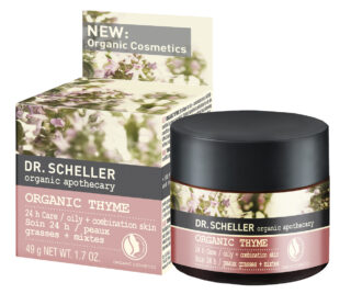 Dr.Scheller Organic Thyme 24 HR Care 1.7 oz. Organic thyme essences have anti-bacterial and anti-inflammatory effects on the skin which hep fight impure skin & pimples. Organic willow tree bark extract and organic cucumber help to refine pores and balance oil production in the skin for a more even, balanced complexion. Sunlower kernel oil, jojoba oil and almond oil also pamper the skin for a soft, supple feeling. Perfect for oily, combination and impure skin with pimples and/or blackheads. Great for all ages.