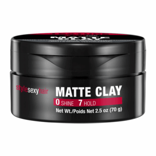 Style Sexy Hair Matte Clay separates, defines and molds hair in place. Helps tame unruly ends. Washes off easily. Ideal for most hair types. Hold 7 Shine 0.